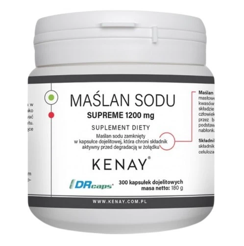 - Kenay Maślan Sodu SUPREME to suplement diety przeznaczony dla osób dbających o układ trawienny i jelitowy. Produkt zawiera maślan sodu – sól sodową kwasu masłowego, należącego do krótkołańcuchowych kwasów tłuszczowych (SCFA).
