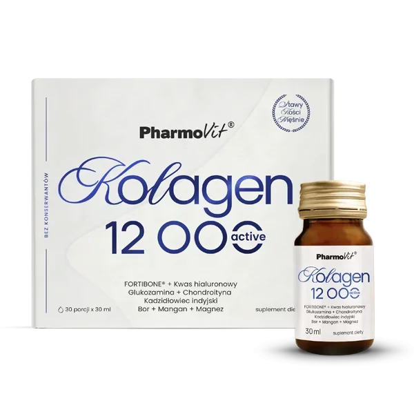 Kolagen 12 000 Active to suplement diety w płynie, zawierający kolagen wołowy (w tym przebadany klinicznie kolagen FORTIBONE®), glukozaminę, siarczan chondroityny, MSM, kwas hialuronowy oraz wybrane witaminy i minerały. Kolagen jest białkiem naturalnie występującym w organizmie i stanowi podstawowy element tkanki łącznej, obecnej m.in. w skórze, kościach i stawach. Kwas hialuronowy jest kluczowym składnikiem macierzy międzykomórkowej skóry oraz stanowi ważny element mazi stawowej.