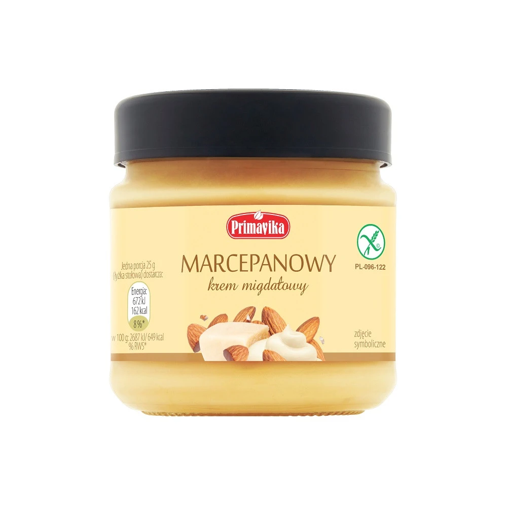 - Pasta marcepanowa to aromatyczny produkt na bazie prażonych migdałów, wyróżniający się intensywnym smakiem i kremową konsystencją. Idealnie sprawdzi się jako dodatek do deserów, wypieków, naleśników, gofrów lub do bezpośredniego spożycia.