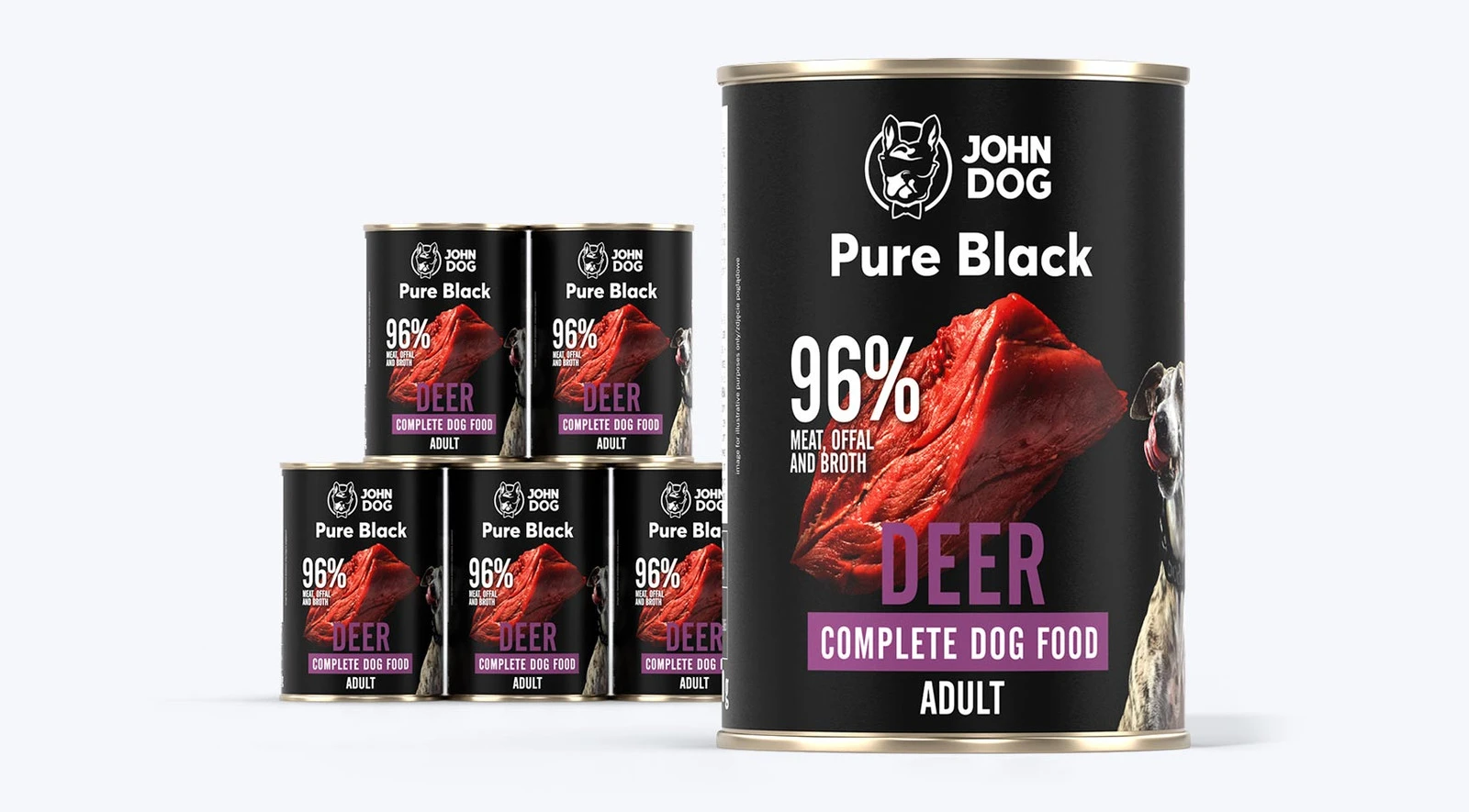 - John Dog Pure Black Jeleń to pełnoporcjowa, wysokomięsna karma mokra dla dorosłych psów wszystkich ras.
