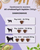 Spokój i Relaks to funkcjonalne, miękkie kąski dla psów, które łączą wygodę podawania z działaniem „o mocy suplementu”. To wsparcie dla psów wrażliwych na bodźce, reagujących napięciem lub trudnością w wyciszeniu. Celem stosowania nie jest usypianie, lecz wspieranie samoregulacji i obniżenie napięcia w układzie nerwowym, co pomaga w stresujących sytuacjach i poprawia jakość odpoczynku.