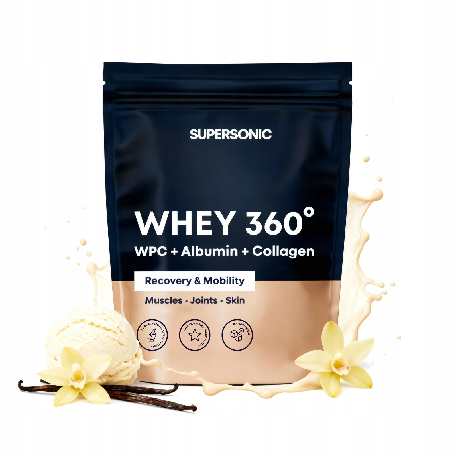 - SUPERSONIC Whey 360° to odżywka białkowa w proszku oparta o trzy źródła białka: koncentrat białka serwatkowego (WPC 80), białko jaja (albumina) oraz hydrolizowany kolagen morski Peptan®. Produkt stanowi wygodne uzupełnienie diety w białko.