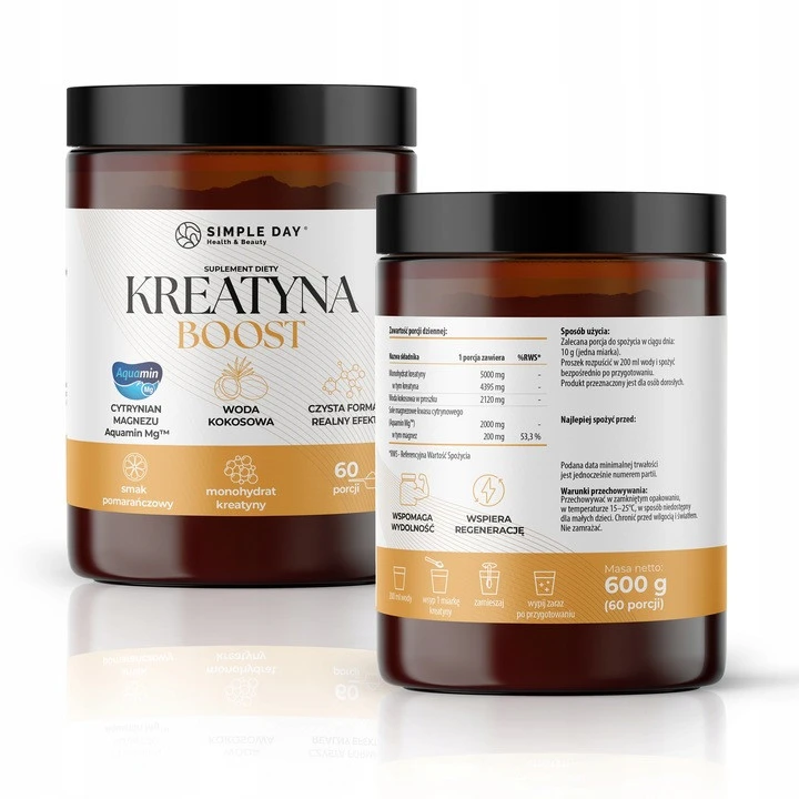 - KREATYNA BOOST to suplement diety łączący monohydrat kreatyny, magnez Aquamin Mg™ oraz wodę kokosową w proszku.