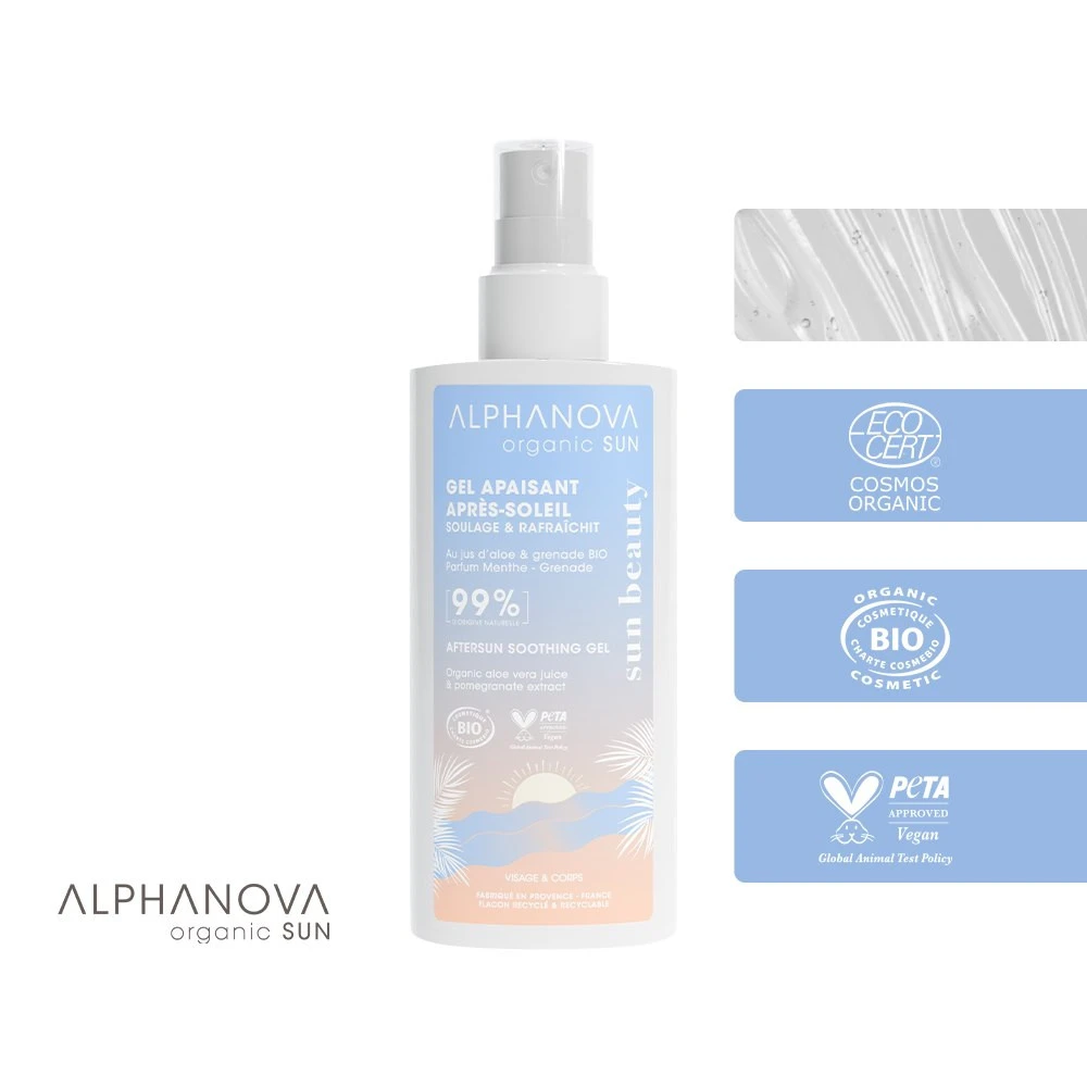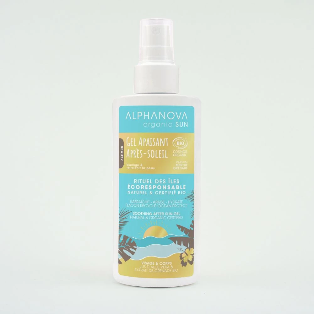 Kojący żel po opalaniu, który zawiera organiczny sok z aloesu, organiczny ekstrakt z granatu i miętową wodę kwiatową, dzięki czemu jest orzeźwiającym eliksirem dla skóry.