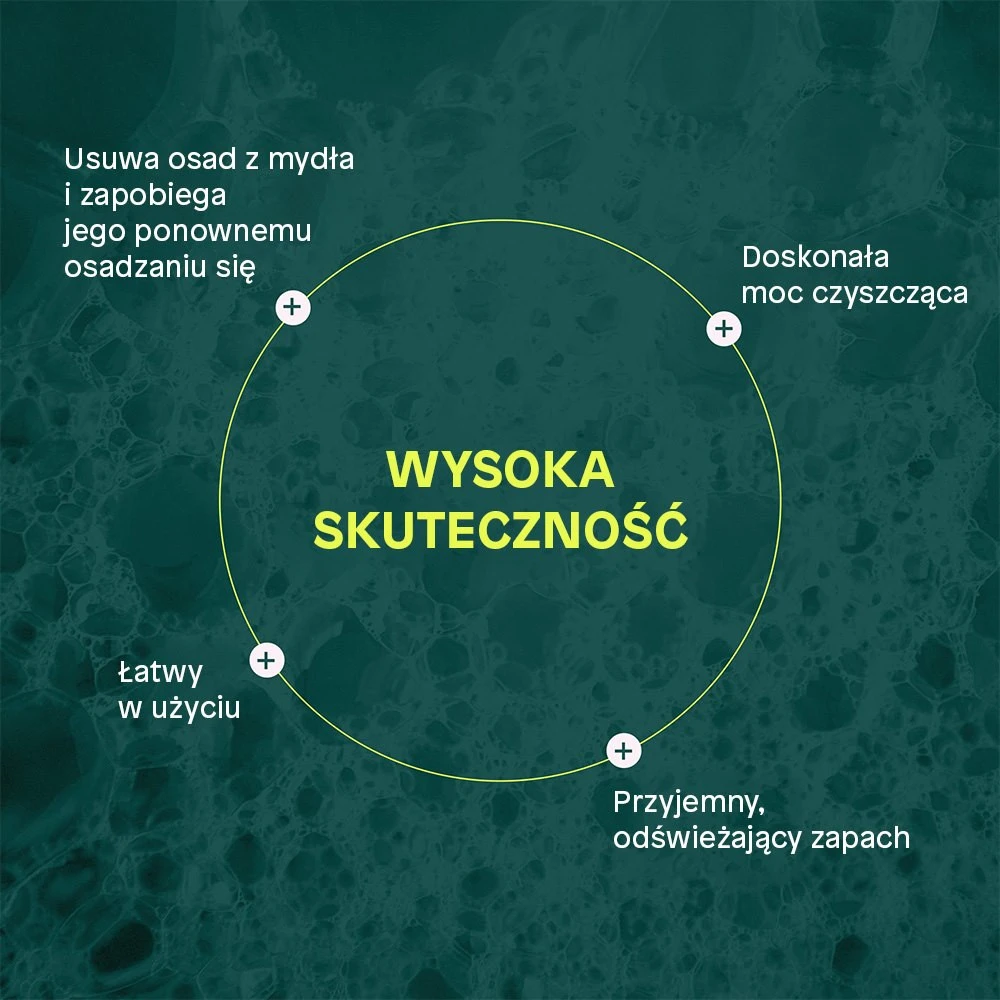 Sposób użycia: Spryskuj codziennie kabinę prysznicową. Przy mocnych zabrudzeniach ostatecznych rezultatów oczekuj po 3-4 tygodniach lub wytrzyj po pierwszym użyciu Wybierz świadomie