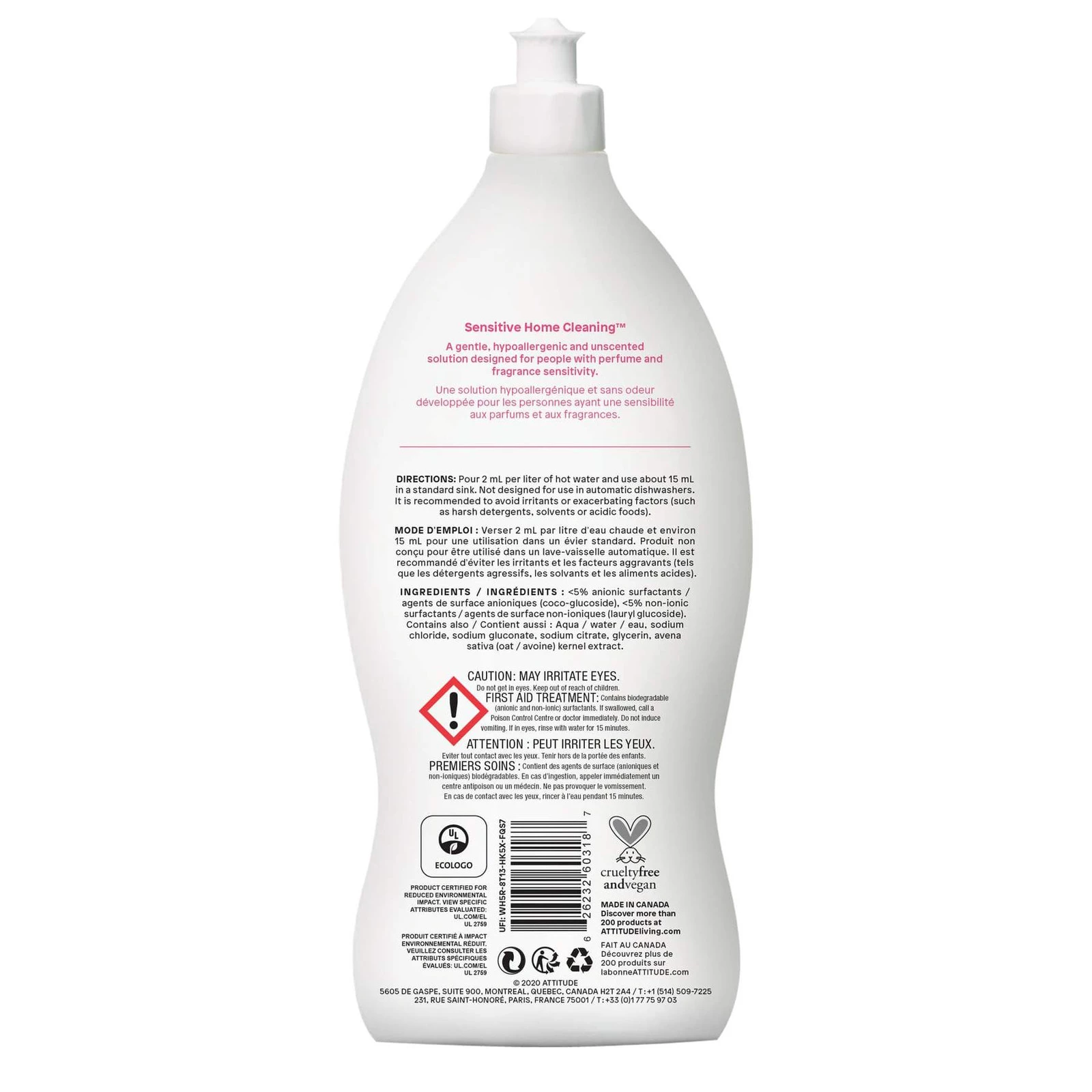 Testowany dermatologicznie, nie drażniący i hipoalergiczny Przyjazny dla środowiska, biodegradowalny i naturalny Wyprodukowany z naturalnych składników Posiada kanadyjski ekologiczny certyfikat EcoLogo Bez zapachu Zawiera więcej niż 95% biologicznie rozkładalnych składników Ten produkt posiada certyfikat National Eczema AssociationStosowanie: powinien być używany w proporcjach 2 ml na litr ciepłej wody, a 15 ml na standardową pojemność zlewozmywaka lub miski.