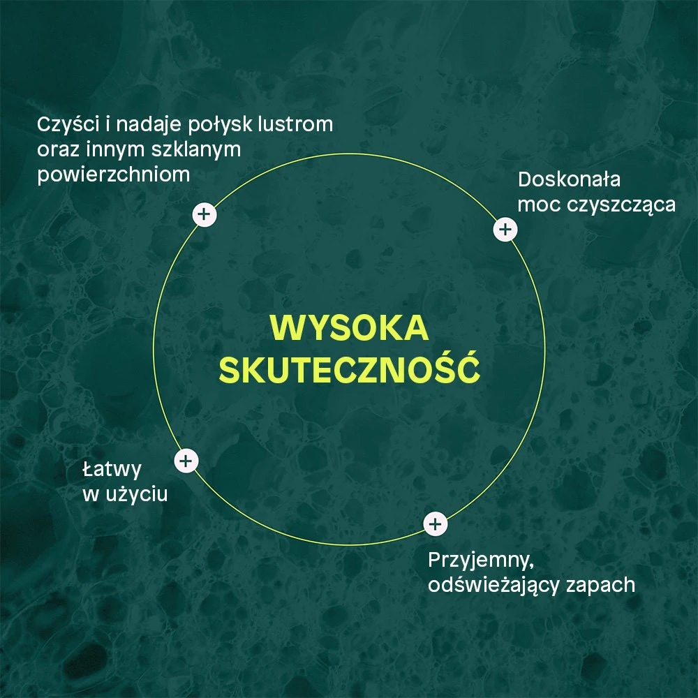 Środek do czyszczenia luster i szkła jest zapakowany w praktyczną butelkę ze spryskiwaczem i nie trzeba go spłukiwać po umyciu, aby cieszyć się efektem bez smug.