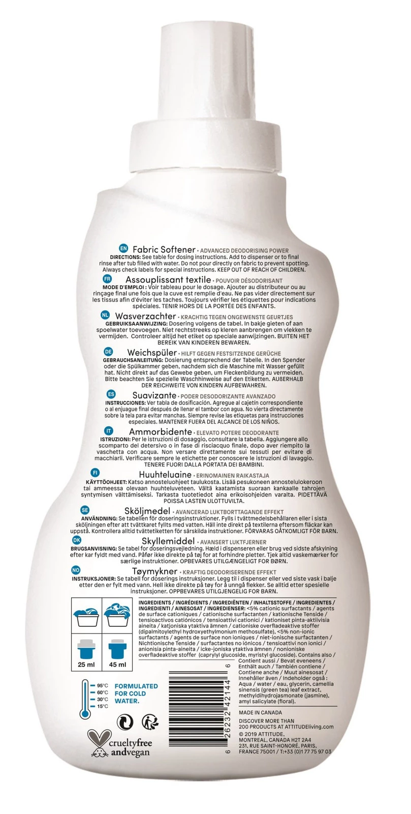 Bezpieczny skład - Wszystkie produkty ATTITUDE pozbawione są składników rakotwórczych, czynników mutagennych i ingerujących w pracę układu hormonalnego Wegańskie i Cruelty-Free - nasze produkty są wegańskie, nie zawierają żadnych substancji odzwierzęcych, co potwierdza certyfikacja PETA ATTITUDE należy do programu Beauty Without Bunnies. Testowane w niezależnych laboratoriach - Brak kancerogennych substancji w naszych produktach (m.in. 1,4-dioksanu, tlenku etylenu) potwierdzają niezależne laboratoria. Produkcja artykułów ATTITUDE nie wpływa na zwiększenie emisji CO2 do atmosfery - używamy energii całkowicie odnawialnej. Sadzimy też drzewa, by zmniejszyć emisję gazów cieplarnianych Podlegające recyklingowi - butelki produktów ATTITUDE stworzone są z plastiku, który najlepiej nadaje się do recyklingu, czyli z HDPE #2 Hipoalergiczne - hipoalergiczne produkty ATTITUDE o zapachach pochodzących z naturalnych składników Naturalne - wszystkie nasze produkty tworzone są na bazie substancji roślinnych i mineralnych Posiadają certyfikację EcoLogo, uznawaną na całym świecie i nadawaną produktom, które spełniają najbardziej rygorystyczne standardy dotyczące ochrony środowiska jak i zdrowia człowieka Zrównoważone - W każdym naszym działaniu staramy się odtworzyć naturalny cykl życia przyrody. Od wykorzystania świeżego składnika aż po gotowy produkt trafiający do Twoich rąk - w całym tym procesie walczymy o wyeliminowanie negatywnego wpływu na środowisko naturalne Produkowane w Kanadzie - nasze krystalicznie czyste, naturalne produkty spełniają i przewyższają kanadyjskie standardy dotyczące jakości i bezpieczeństwaSposób użycia: 25-45 ml w zależności od ilości prania. Nie nanosić bezpośrednio na tkaninę.