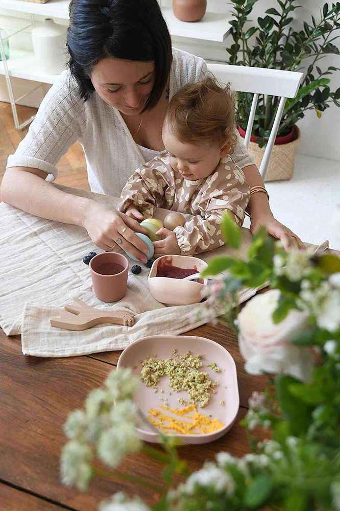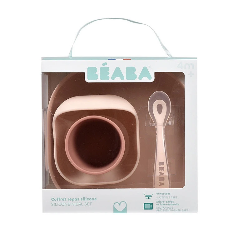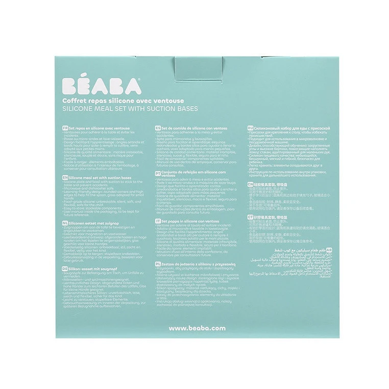 Komplet naczyń z silikonu francuskiej marki BEABA składa się z talerzyka, miseczki, kubka i łyżeczki treningowej. Wszystkie elementy zestawu charakteryzuje ergonomiczny, zaokrąglony kształt i miękkie, gładkie brzegi. Wyższe boki miseczki i talerzyka ułatwiają dziecku samodzielne nabieranie posiłku na widelec czy łyżkę. Naczynia te mają na spodzie antypoślizgową przyssawkę, dzięki czemu są stabilne i dobrze trzymają się stołu. Kubeczek jest poręczny i wygodny do nauki picia, a łyżeczka idealnie dopasowuje się do dziecięcej buzi i można ją odłożyć tak, by główka nie dotykała powierzchni, dzięki czemu jej używanie jest o wiele bardziej higieniczne.