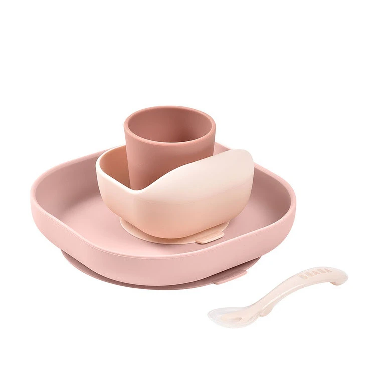Beaba, Komplet naczyń z silikonu z przyssawką, pink