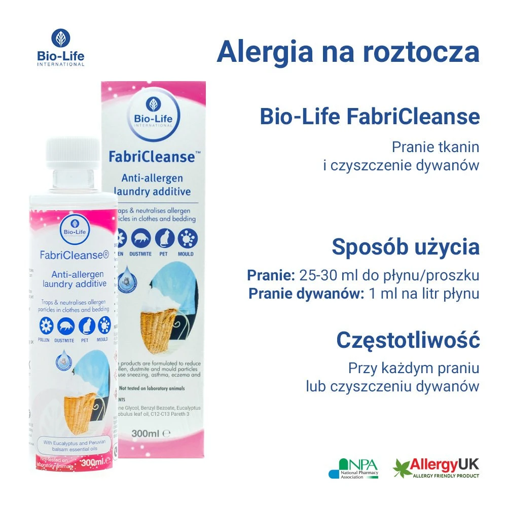 Bio-Life FabriCleanse™ to specjalistyczny produkt do prania, zaprojektowany z myślą o osobach cierpiących na alergie spowodowane alergenami odzwierzęcymi, roztoczami i pyłkami. Formuła FabriCleanse™ neutralizuje i denaturuje alergeny, eliminując ponad 95% zanieczyszczeń z ubrań i pościeli już przy użyciu 50 ml na jedno pranie, bez względu na temperaturę wody. Dzięki temu, możesz skutecznie usunąć alergeny nawet w niskich temperaturach, co sprawia, że produkt jest wszechstronny i wygodny w użyciu.