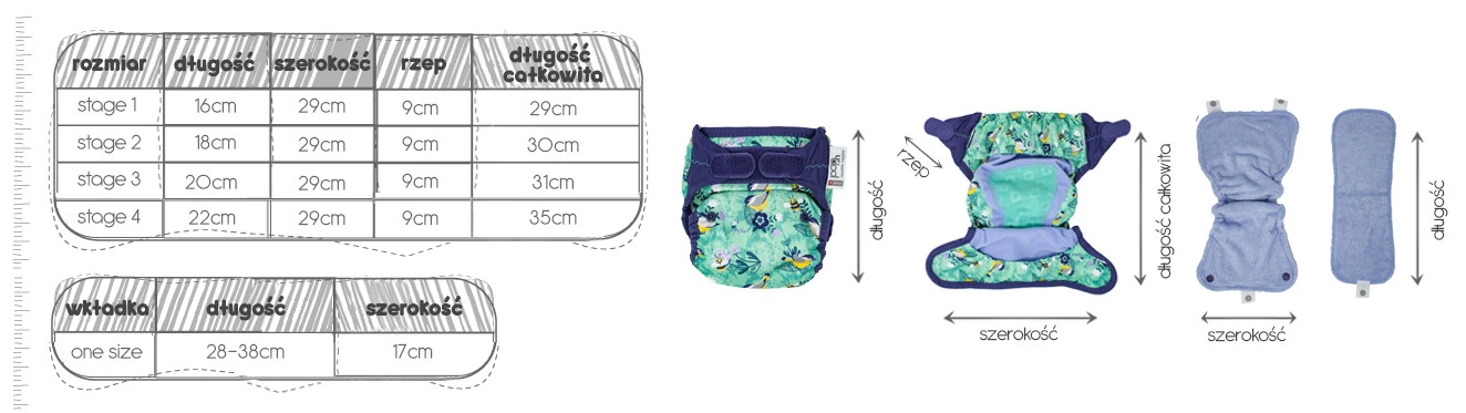 1. To pieluszki dla dziecka na cały okres pieluszkowania od narodzin aż do chwili, w której zacznie korzystać z nocnika. Jest to możliwe dzięki napom, pomagającym odpowiednio regulować wysokość pieluszki i wytrzymałym bocznym rzepom do regulacji szerokości.