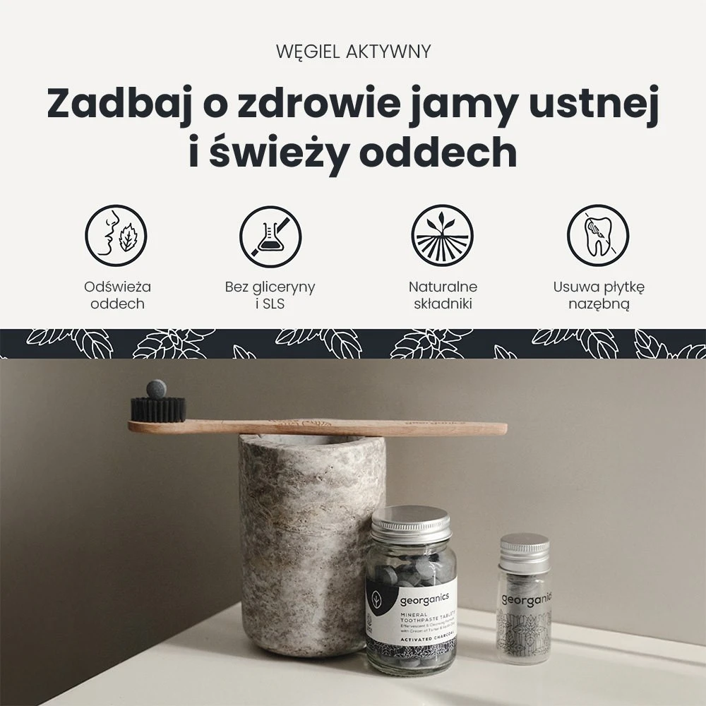 Wygoda, naturalne wybielanie i Zero Waste w jednym! Tabletki do mycia zębów Georganics z aktywnym węglem to idealna, ekologiczna alternatywa dla pasty, zwłaszcza w podróży.