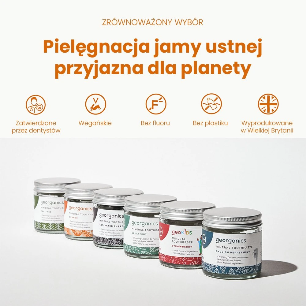 Produkty marki Georganics to doskonały wybór dla wszystkich, którzy chcą zadbać o swoje zęby i dziąsła kompleksowo. Dzięki swoim łagodnym składnikom pasty, olejki i tabletki mogą być stosowane przez każdego: zarówno dzieci, jak i dorosłych, u których występuje tendencja do podrażnień i krwawienia dziąseł. Wygodny kształt pojemników pozwala na przechowywanie ich na półce w łazience, a także w torbie podróżnej. Ekologiczne szczoteczki do zębów stanowią doskonałą alternatywę dla markowych odpowiedników wykonanych z tworzyw sztucznych.