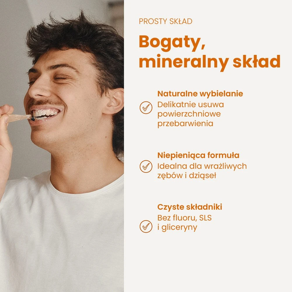 Formuła bez fluoru, SLS i gliceryny skutecznie czyści, opierając się na minerałach i organicznych olejach.