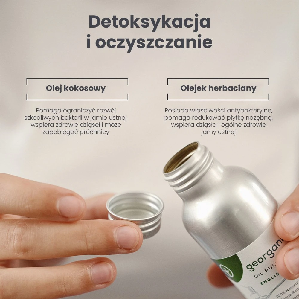 * Naturalne Oczyszczanie: Regularne płukanie olejem usuwa osad, bakterie i redukuje płytkę nazębną.