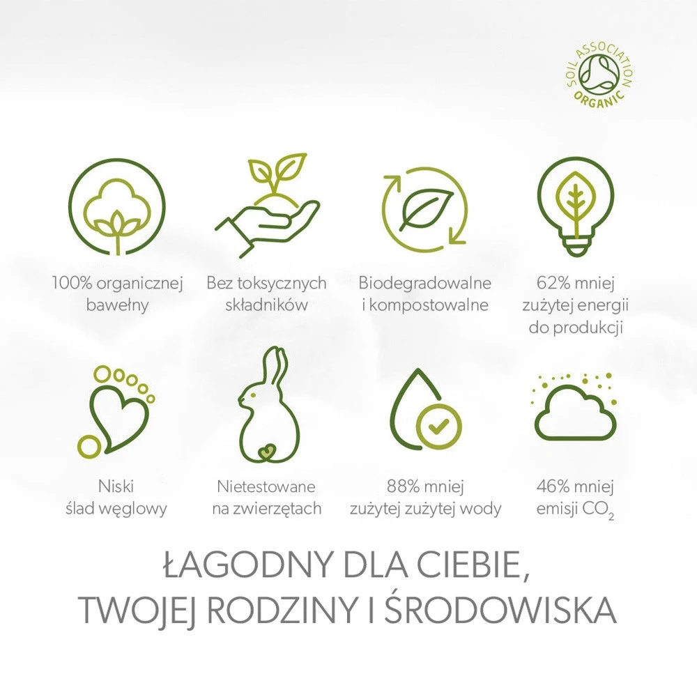 100% bawełny organicznej z papierowymi łodygami FSC. Zapakowane w papierowe pudełko zapewniające zrównoważony rozwój.
