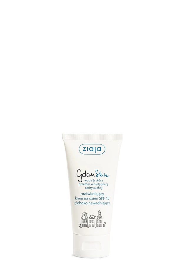 - Rozświetlający, głęboko nawilżający krem na dzień GdanSkin od Ziaja. Kremowa emulsja do cery suchej z filtrem SPF15. Wzbogacony o rozświetlające drobinki. Idealny jako baza pod makijaż.