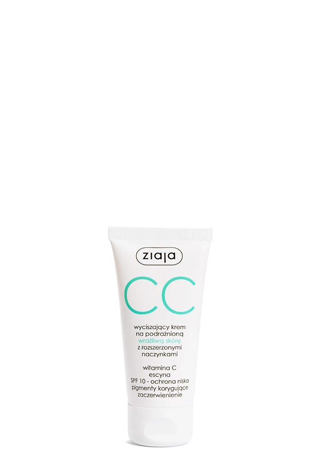 - Innowacyjny krem CC stworzony przez markę Ziaja. Do skóry wrażliwej z rozszerzonymi naczynkami. Eliminuje zaczerwienia skóry i wyrównuje jej koloryt. Z dodatkiem filtra SPF10.