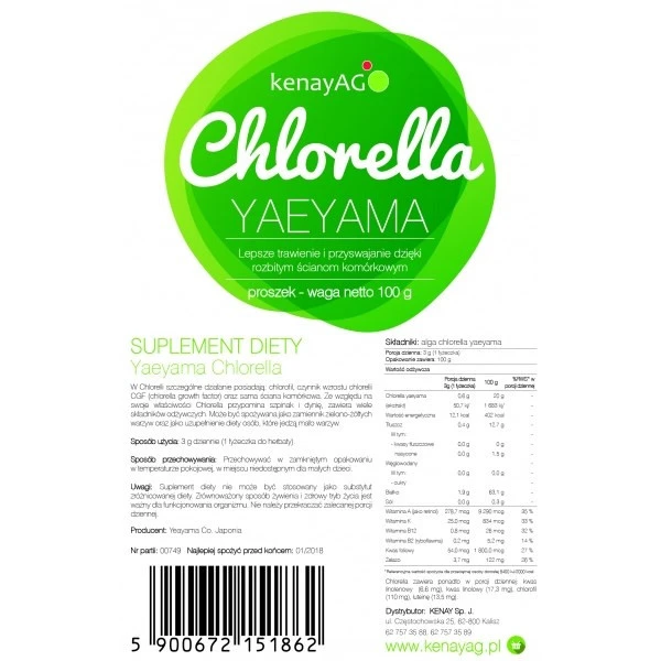 Produkt Chlorella Yaeyama (100 g) Kenay to suplement diety. Nie może być stosowany jako substytut zróżnicowanej diety. Pamiętaj o zrównoważonym sposobie żywienia i zdrowym trybie życia.- Przechowuj w chłodnym miejscu, z dala od bezpośredniego światła słonecznego.