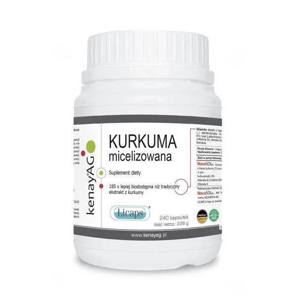 Podsumowując, Kenay Kurkuma Micelizowana Licaps 240 kapsułek to zaawansowany suplement diety, który zawiera starannie dobrane składniki. Technologia micelizowania sprawia, że produkt ten charakteryzuje się aż 185 x lepszą biodostępnością niż tradycyjny ekstrakt.