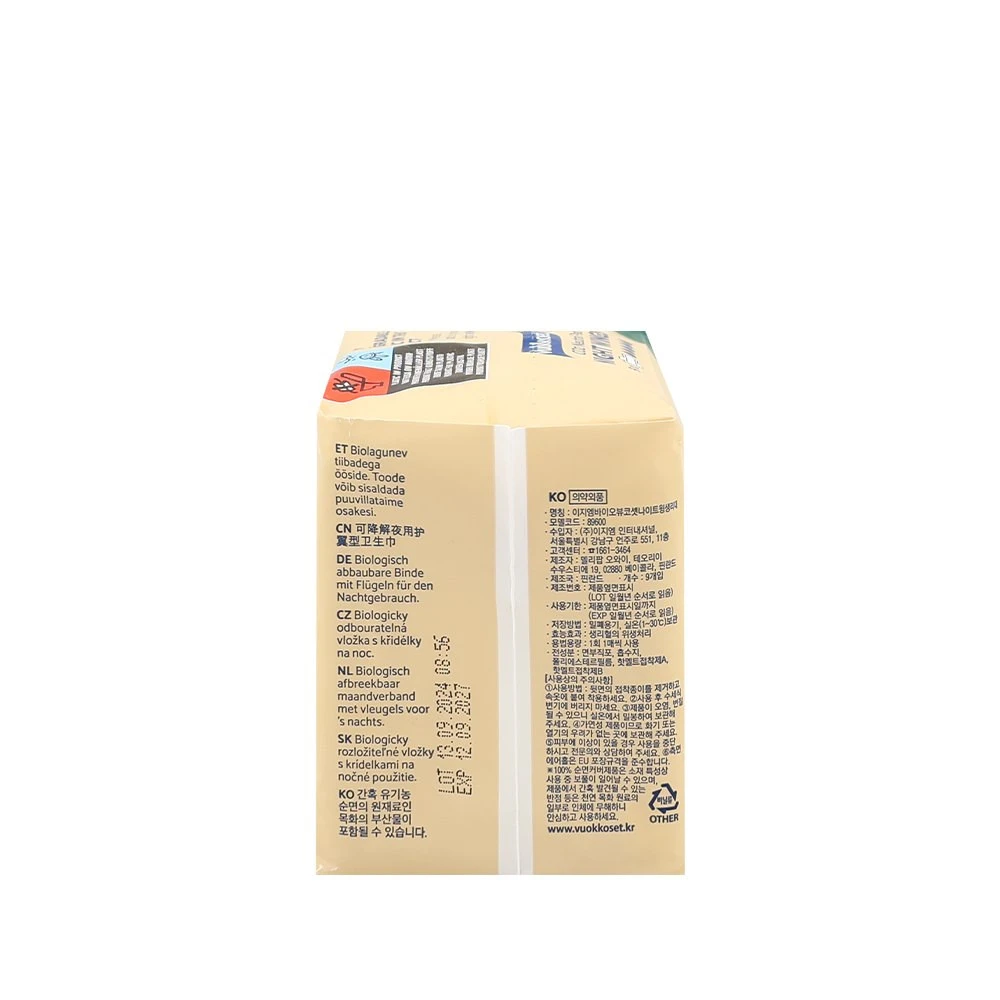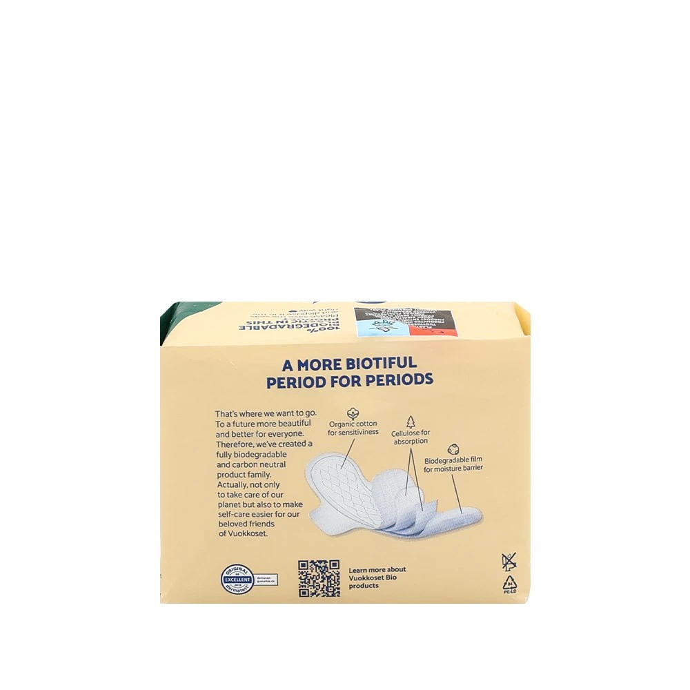 Podpaski Vuokkoset z linii BIO są pakowane pojedynczo w owijki, bo to higieniczne i wygodne. Zewnętrzne opakowania podpasek wykonane jest z odnawialnego tworzywa pochodzenia naturalnego – Green PE nie jest biodegradowalne, nadaje się do recyklingu. Wszystko w duchu redukowania wpływu na środowisko, aby odciążyć Matkę Naturę.