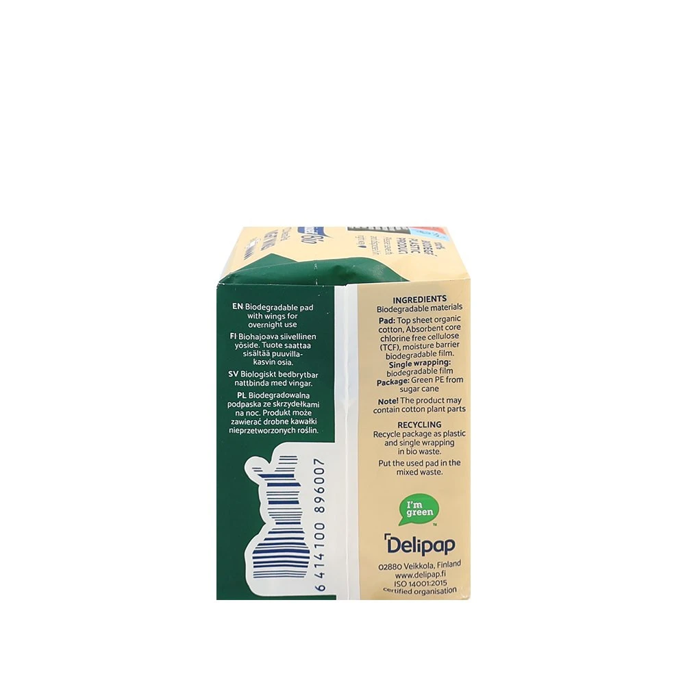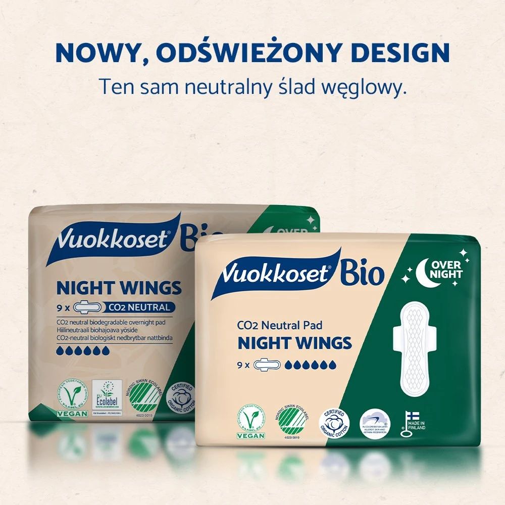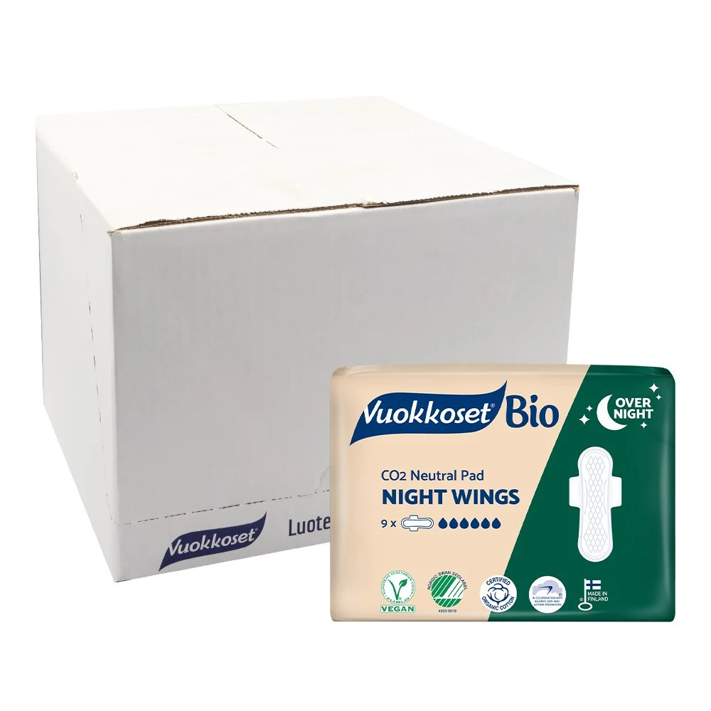 Podpaski Vuokkoset BIO Night Wings są w pełni biodegradowalne i gwarantują komfort w nocy. Nasza nocna podpaska została zaprojektowana tak, aby się dopasować do Ciebie i Twoich potrzeb: nawet podczas intensywnego krwawienia zapewni ci komfort i bezpieczeństwo dzięki wydłużonemu kształtowi i większej powierzchni chłonącej.