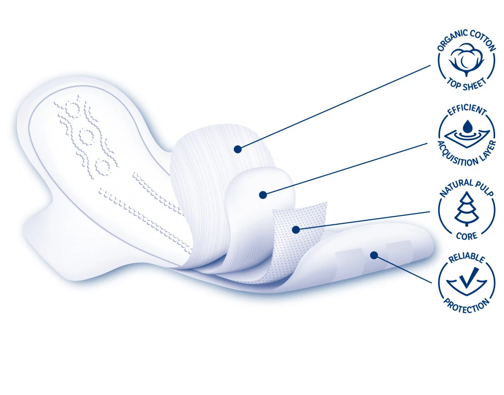 Warstwa chłonna została wykonana z bawełny organicznej nie bielonej chlorem. Podpaska została wyposażona w specjalną powłokę, dzięki której skóra może swobodnie oddychać.