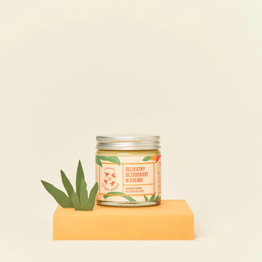 Dezodorant w kremie od Czterech Szpaków to naturalna alternatywa dla antyperspirantu. Produkt skutecznie pochłania wilgoć, niweluje nieprzyjemny zapach i zapewnia uczucie komfortu, jednak robi to w zgodzie z naturą, nie blokując niezbędnego ciału procesu, jakim jest pocenie. Delikatna wersja bez dodatku sody powstała w odpowiedzi na potrzeby wszystkich tych, którzy borykają się z problemem skóry wrażliwej, skłonnej do podrażnień i alergii. Mandarynkowy zapach na pewno spodoba się wielbicielom i wielbicielkom słodkich, świeżych aromatów. Kosmetyk jest niezwykle wydajny - słoiczek wystarcza na ok. 4 miesiące użytkowania.